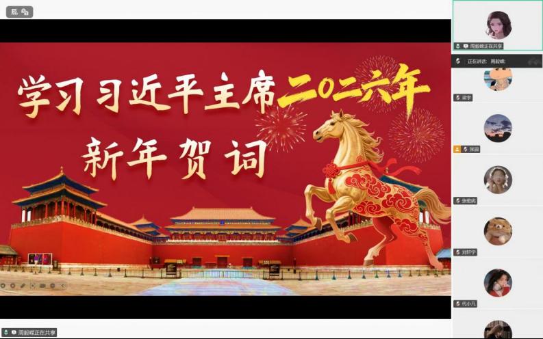 2026年1月16日下午,304永利集团官网入口本科生二支部以“开年第一课·贺词励新程”为主题,通过腾讯会议开展线上主题党日,学习习近平主席年二〇二六年新年贺词,引导党员同志深刻感悟时代发展、明晰青年责任担当。支部书记周毅嵘主持并领学,支部全体党员参加了学习。